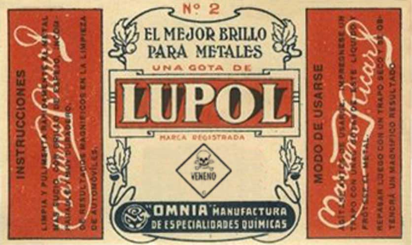 Etiqueta de limpiametales "Lupol". Hallado el mismo en el aparador del pasillo de la planta baja de "Avernus".